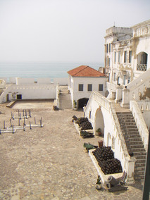 Nous visitons le fort de Cape Coast, destiné à défendre la côte, haut lieu du commerce de l’or et des esclaves. La rampe de terre qui plonge vers le donjon des esclaves fait songer à une porte vers l’enfer…