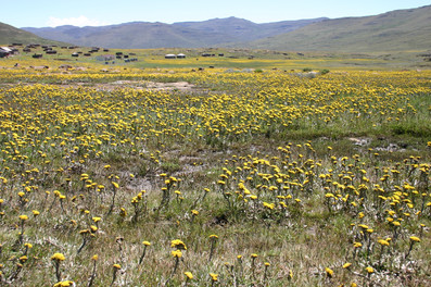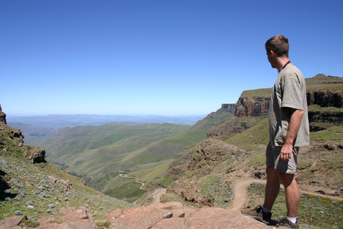En arrivant au sommet, le Sani Top à 2 800 m d’altitude, nous faisons halte dans le chalet-refuge qui est aussi « le plus haut pub d’Afrique ». De là, le panorama est splendide : d’un côté la vue plonge dans la vallée de la passe et on aperçoit de lointains sommets en Afrique du Sud ; de l’autre, c’est le Lesotho et un immense plateau cerné de montagne est couvert de prairies de fleurs. Les cases sont en pierre et ont un toit de chaume. Leurs fenêtres et leurs portes sont peintes de couleurs vives.