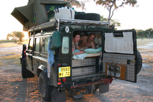 Les bivouac sont, comme à Chobe, non clôturés et il faut faire attention aux animaux sauvages. Comme les nombreux visiteurs sud-africains ou namibiens, nous allumons un feu à la tombée du jour et, le dîner terminé, nous nous couchons. Papy et Mamie regagnent courageusement leur lit dans le Land. Dans le Nord du parc, le campement est installé non loin d’un point d’eau habité par des hippopotames. Leurs grognements et cris sont si puissants qu’ils parviennent à nous réveiller ! Léa n’a pas peur du loup mais se réfugie entre Papa et Maman…