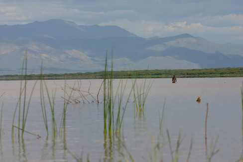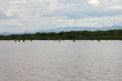 Encore un peu plus au Nord, nous arrivons à un autre lac de la vallée du Rift : le lac Baringo. Nous y faisons une promenade en barque pour voir crocodiles, hippos et les nombreux oiseaux qui y demeurent. Des pêcheurs marchent dans l’eau peu profonde en tirant leurs filets. Non loin de là sur la rive, dorment les crocodiles. Il n’y a paraît il pas d’accident… Le barreur lance dans l’eau, au loin, en sifflant, un poisson dans lequel il a placé un morceau de balsa pour le faire flotter. Un aigle pêcheur arrive d’un long vol plané, se saisit du poisson à quelques mètres de notre embarcation. Il part ensuite le déguster dans un arbre sur la rive. Superbe spectacle !