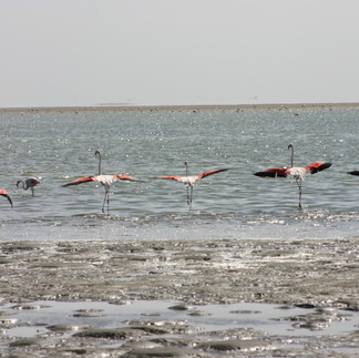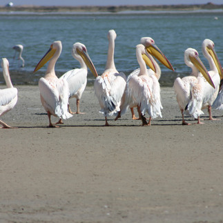 Nous rejoignons ensuite Walvis Bay, où flamands roses et pélicans barbotent pour le plaisir des villas luxueuses alignées sur le littoral. On ramasse quelques belles plumes roses, égarées sur la plage. Elles rejoignent les grandes plumes d’autruches qui ornent le tableau de bord d’OZ : magnifique ! Plus loin dans la baie, de vastes marais salants à l’eau rose scintillent au soleil frangés de leurs cristaux de sel blancs.